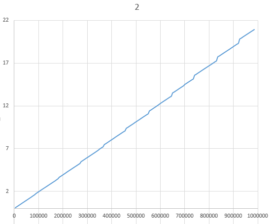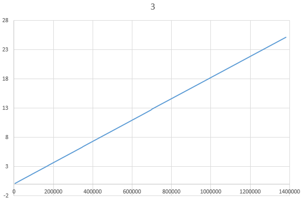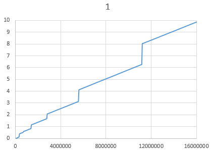 用下面这段代码测试1600w数据,将输出数据拷贝到Excel并生成图表,可以很明显地看出lag的出现规律与上述扩张规则非常相符。