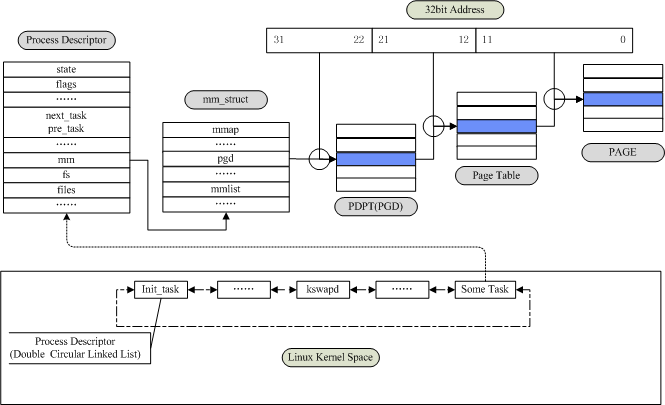 init_tast, double circular linked list, process descriptor, mm_struct, pgd, pt, page ...