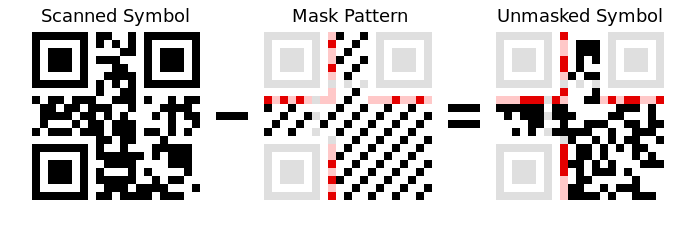 编码器会采用一个掩码过程,从而避免可能对扫描器产生混淆的特征,诸如像定位器模式的形状,或者是大片的空白区域。掩码逆转某些模块(白色变成黑色,黑色变成白色),保留其他模块不变。