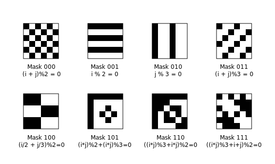 格式信息中的接下来三个bit用于指定对数据区域使用的掩码模式。模式使用6x6放歌的方式定义,根据需要不断重复以覆盖整个区域。模式如下所示,包含了对应的数学公式指明(掩码中的)每个模块是否是黑色(i和j分别是行列从0开始的编号,从左上角开始算起)